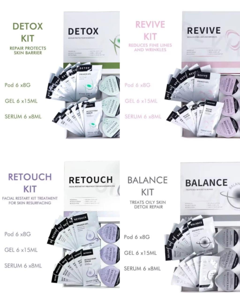 A complete kit with 6 Capsules + 6 Gel + 6 Hydrating Serums.