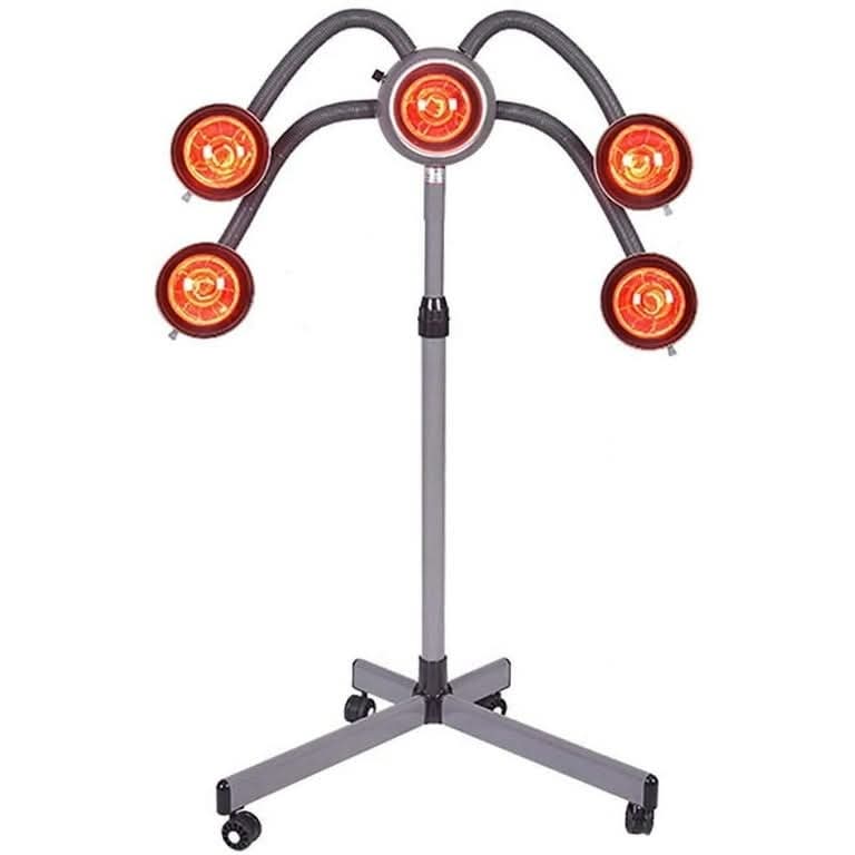 جهاز تدفئة منزلي بالأشعة تحت الحمراء مزوّد بخمسة رؤوس تسخين على أذرع مرنة لتوجيه الحرارة بدقة للعناية بفروة الرأس والشعر والبشرة والجسم. يوفر تدفئة عميقة مريحة مع إعدادات قابلة للتعديل وقاعدة متحركة بعجلات للاستخدام السهل في المنزل أو الصالون.